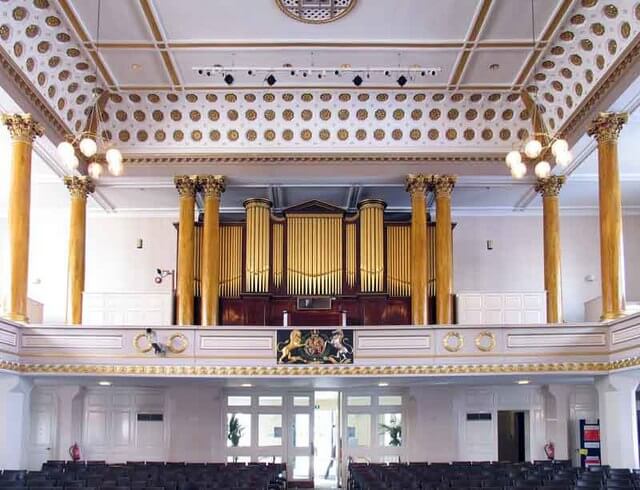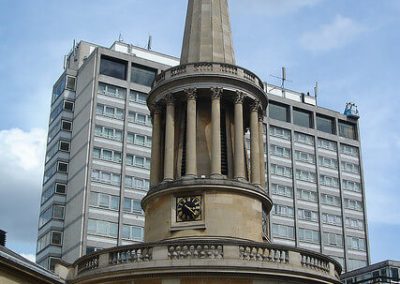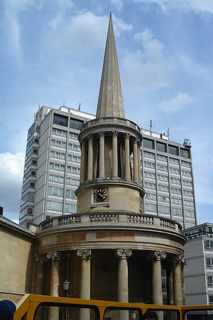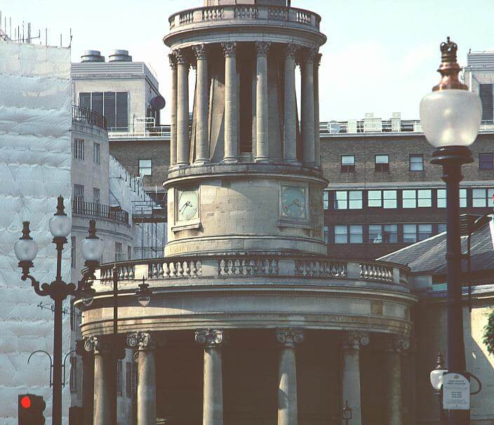 Tehát a Regent’ street végén, a Langham Place közepén ékeskedik egy eklektikus, furcsa épület gótikus toronnyal, alatta kör alakú oszlopcsarnokkal és a mögé kapcsolódó hajóval.