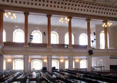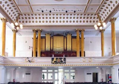 A protestáns felekezeti elvárásokhoz áll közel ez a téralakítás. Meglepő, mennyire nem érezzük a szokásos templomi hangulatot, látszólag alig van szakrális jellege, melyre a térarányok rásegítenek : inkább széles mint magas a belső tér. Egy oltárkép és az orgona ami utal arra hogy templomban járunk. Mondhatnánk, hogy polgárivá vált, szinte. A minimális dekoráció a mennyezeten antik mintákat idéz, a karzaton álló oszlopok fejezetei szintén.
