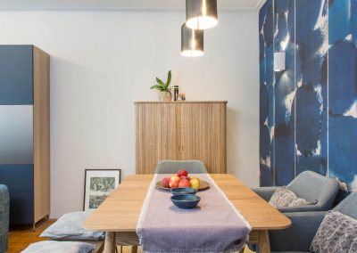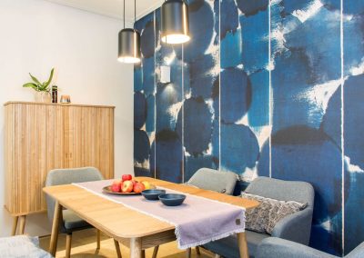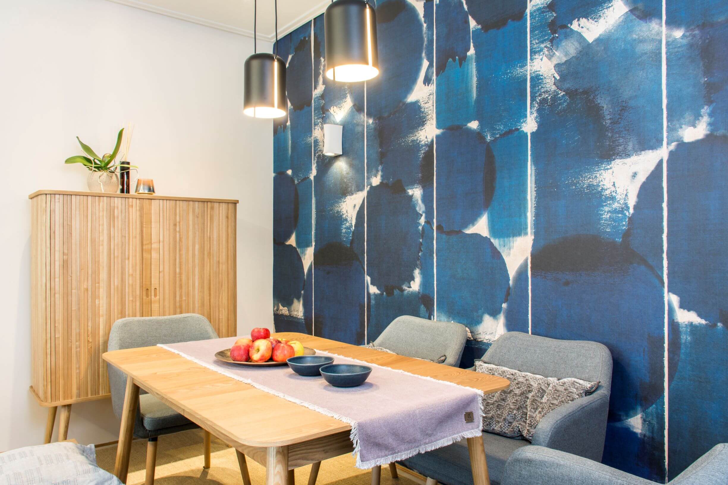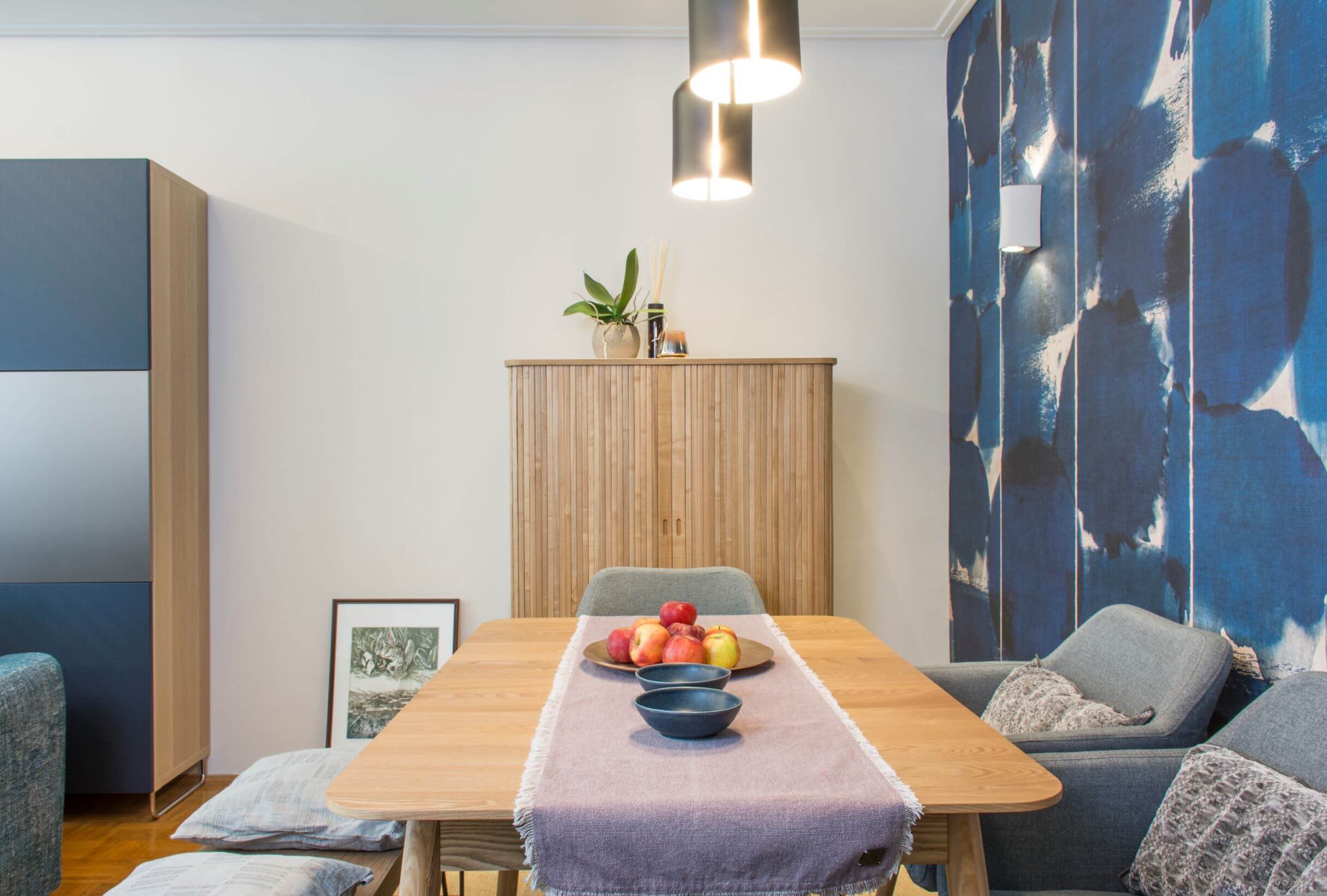 A tizedik emeleten született ez az attraktív étkező-nappali. Az indigókék pacás tapéta izgalmas hátteret ad a dán dizájn étkezőbútornak.
